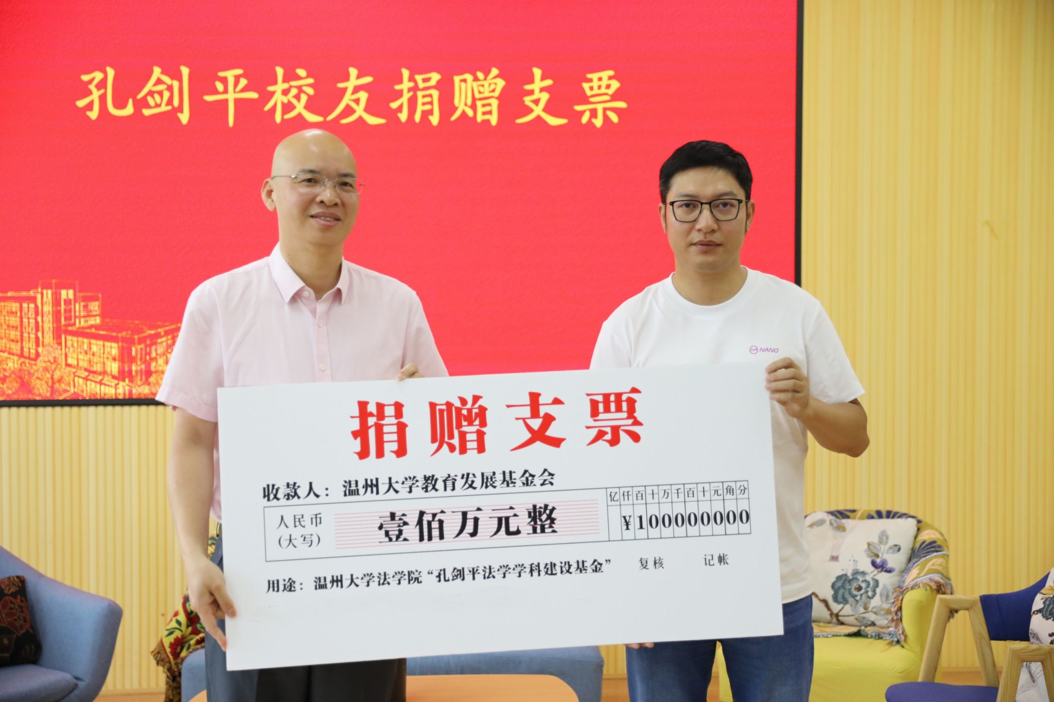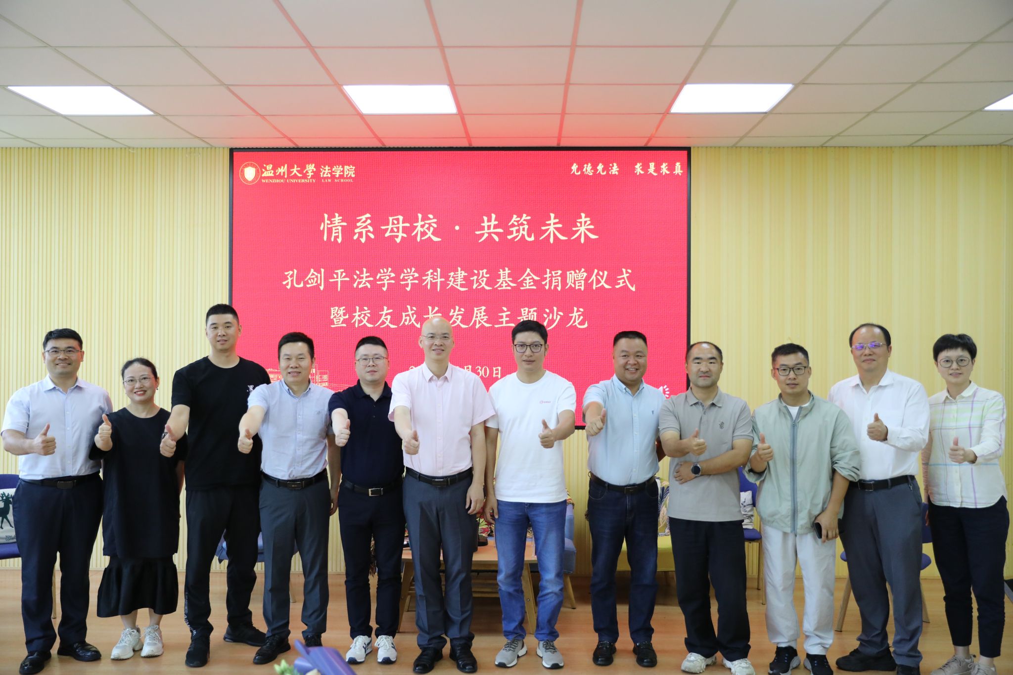 5月30日,温州大学法学院“孔剑平法学学科建设基金”捐赠仪式暨校友成长发展主题沙龙于301报告厅举行。2004级法学专业校友、浙江毫微科技有限公司董事长、香港数码港董事孔剑平博士为母校捐赠100万元,成立孔剑平法学学科建设基金,助力学院高质量发展。2004级法学专业校友林晓国、陈英堂、庄益探、杨利坤、周耀,学院领导班子全体成员、师生代表出席活动。